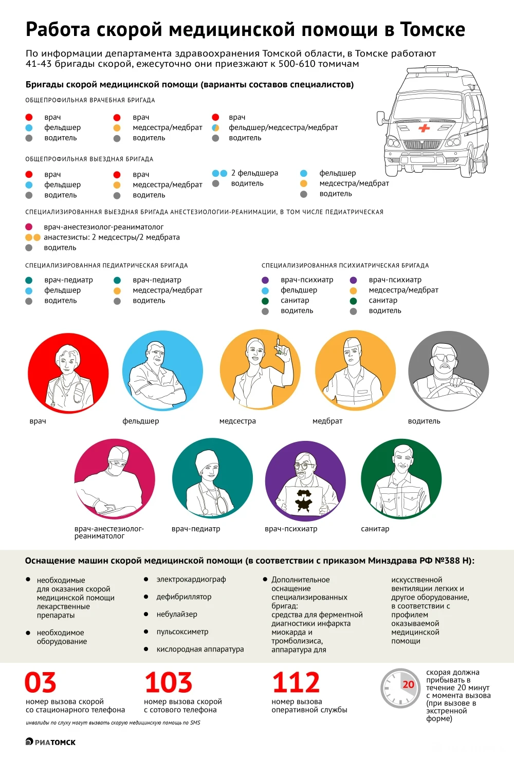Вызвать скорую помощь можно с сотового телефона по номеру 103, со стационарного – по номеру 03 или через оперативную службу, набрав 112. По экстренному вызову бригада медиков должна прибыть в течение 20 минут. Как устроена работа скорой медпомощи в Томске – узнаете из инфографики РИА Томск