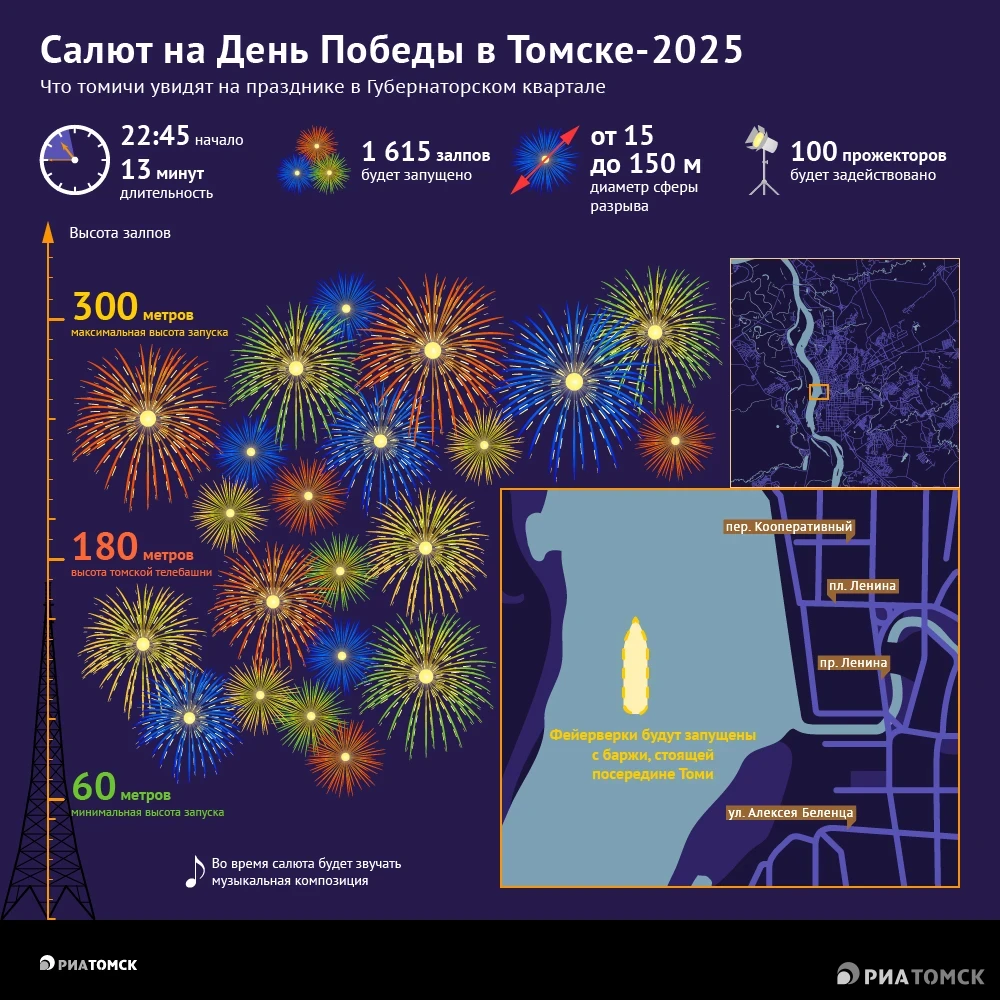 Фейерверк, который можно будет увидеть в Томске 9 мая на набережной Томи, продлится 13 минут. Когда он начнется и какой высоты достигнут залпы – в инфографике РИА Томск.