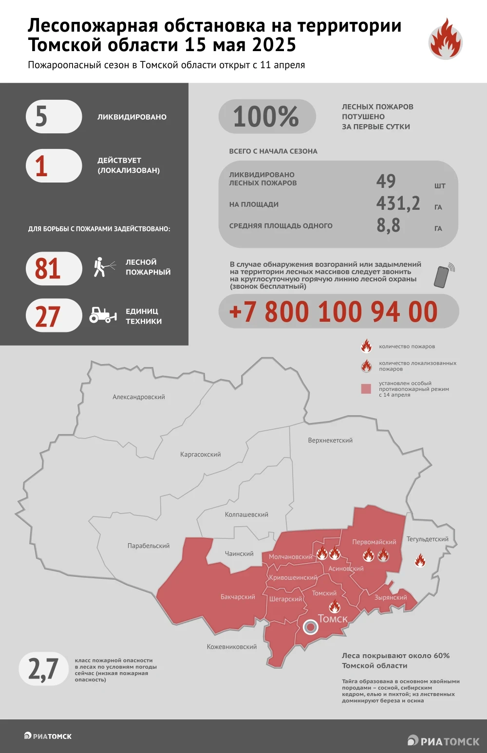 Пять лесных пожаров ликвидировано в Томской области за истекшие сутки. В настоящее время действует один очаг, но возгорание локализовано. Подробнее о борьбе с огнем в наступившем сезоне – в инфографике РИА Томск.