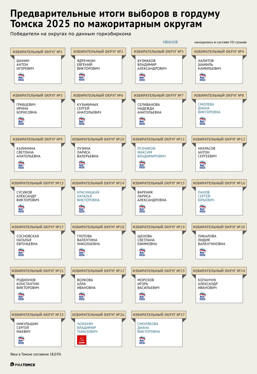 Двадцать семь депутатских кресел в думе Томска распределились по итогам голосования в одномандатных округах. Согласно предварительным данным, 26 мандатов достались кандидатам от "Единой России", одно – представителю КПРФ. Подробнее – в инфографике РИА Томск.
