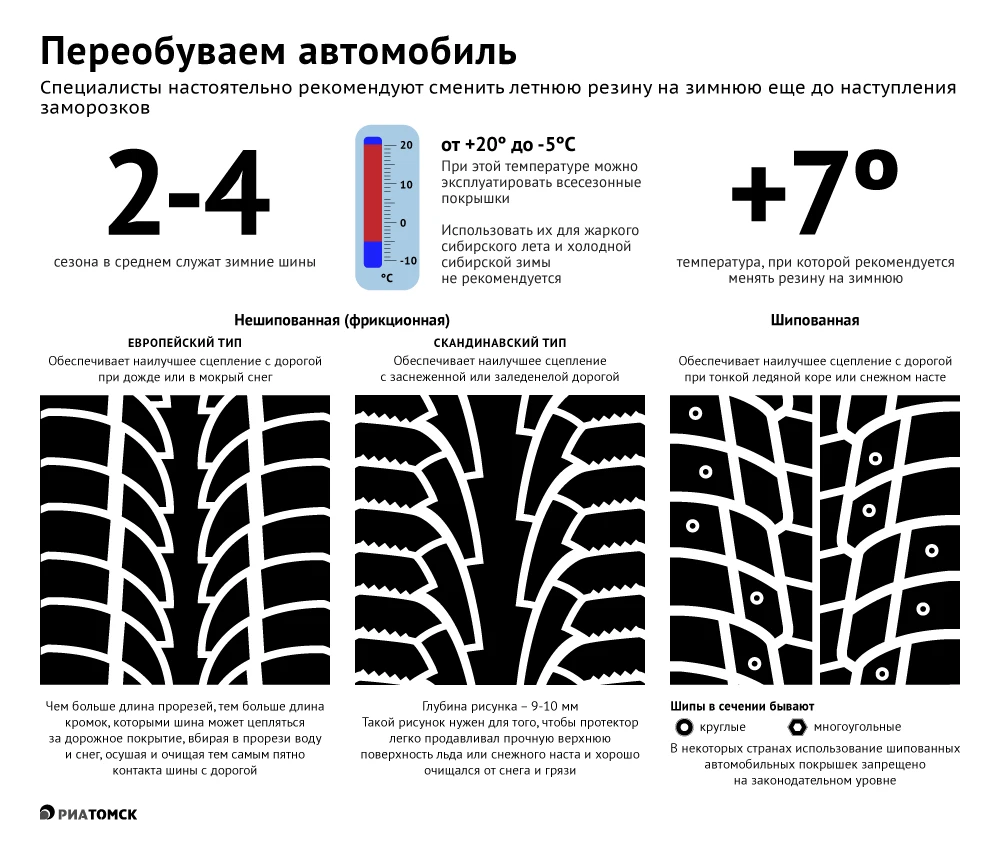 Время менять резину на автомобилях наступило в Томской области. Такую рекомендацию на основе прогноза синоптиков в пятницу распространила Госавтоинспекция. Какие виды зимних шин существуют и при какой погоде передвигаться на летних уже опасно – в инфографике РИА Томск.
