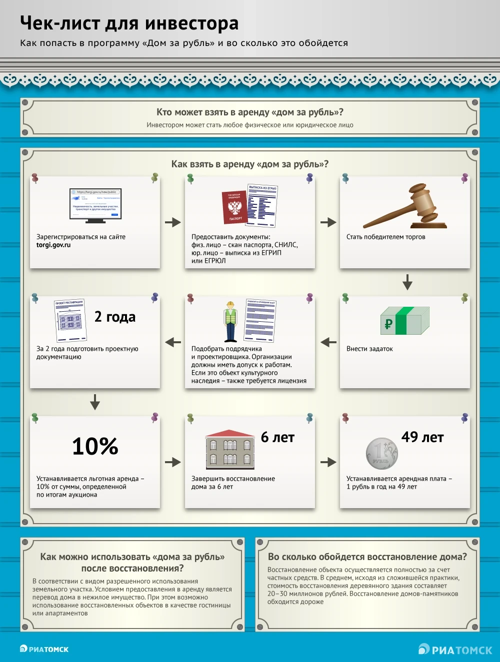 Инвесторы тратят на восстановление исторических зданий в Томске по муниципальной программе "Дом за рубль" в среднем 20–30 миллионов рублей. Какие шаги нужно предпринять, чтобы получить возможность арендовать дом за 1 рубль, сколько времени есть на разработку проекта и завершение работ – в инфографике РИА Томск.