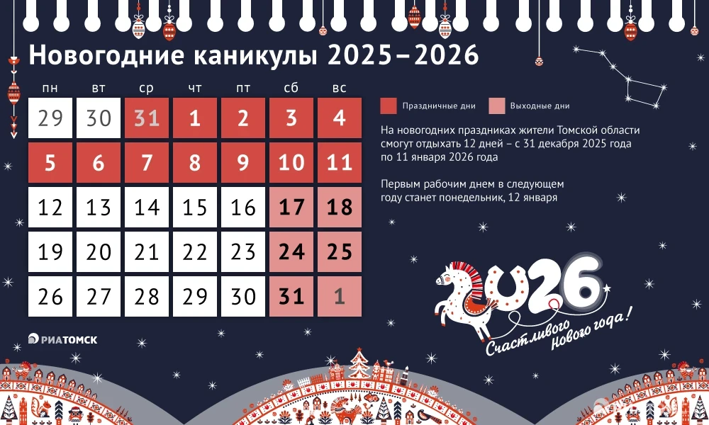 Каникулы продолжительностью 12 дней ждут россиян в предстоящие новогодние праздники. По утвержденному правительством страны производственному календарю, отмечать можно будет с 31 декабря по 11 января. Подробнее – в инфографике РИА Томск.