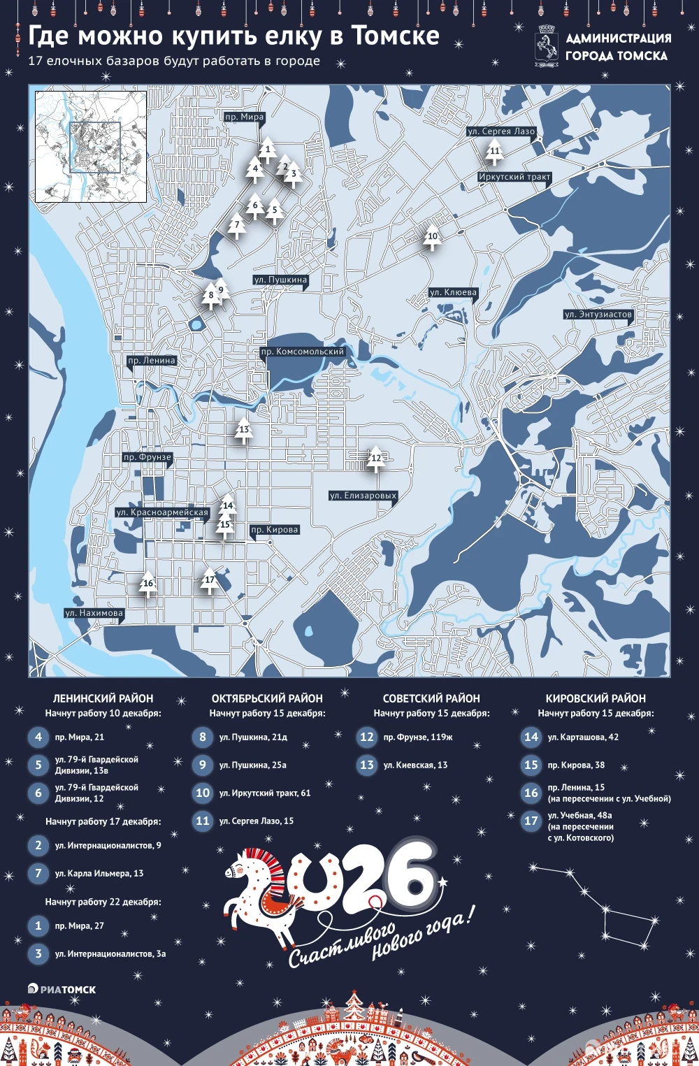 Почти два десятка предпринимателей получили разрешение у властей Томска на открытие елочных базаров перед Новым годом. Самих торговых точек будет немного меньше. Адреса и предполагаемые даты открытия – в инфографике РИА Томск.