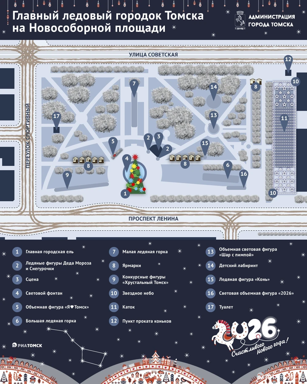 Мастера "Хрустального Томска" в пятницу закончат конкурсные работы, после чего можно сказать – главная площадь города полностью готова к празднованию Нового года. Подробно о том, какие развлечения и праздничные декорации ждут томичей, – в инфографике РИА Томск.