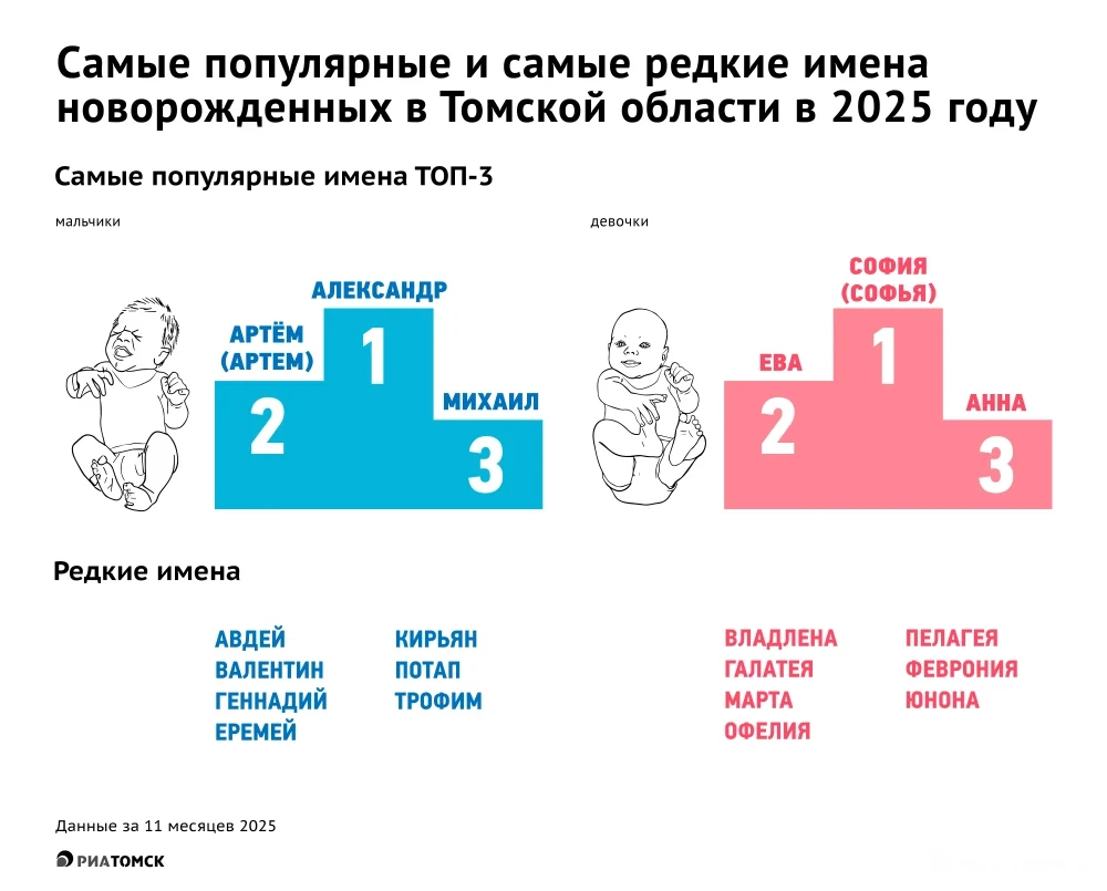София (Софья) продолжает возглавлять список самых популярных женских имен для новорожденных в Томской области. А вот среди родившихся в регионе в 2025 году мальчиков лидировали Александры. Какие еще имена, включая редкие, томичи давали своим детям – в инфографике РИА Томск.