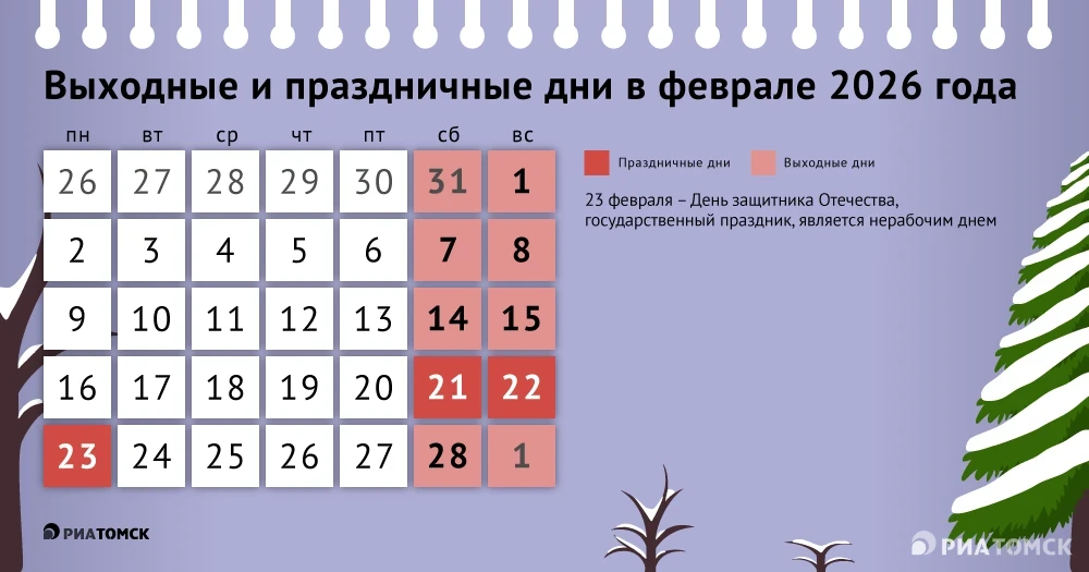 Последняя рабочая неделя февраля в 2026 году в России будет четырехдневной в связи с государственным праздником – Днем защитника Отечества. Календарь на следующий месяц – в инфографике РИА Томск.