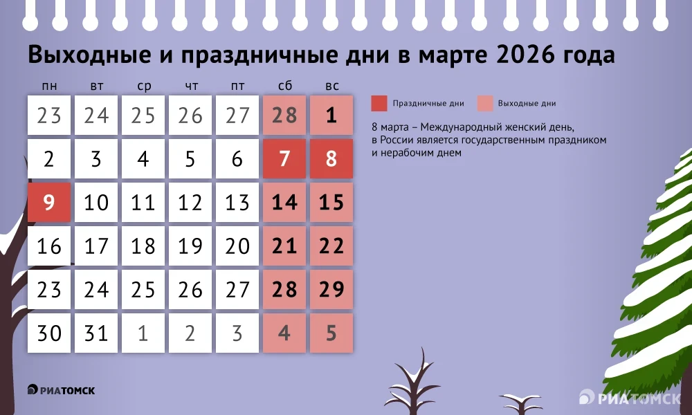 Выходной ждет россиян 9 марта 2026 года из-за того, что Международный женский день выпадает на воскресенье. Вследствие этого вторая рабочая неделя месяца будет короткой. Подробнее – в инфографике РИА Томск.
