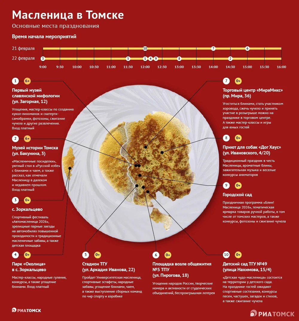 Основные масленичные мероприятия пройдут в Томске и окрестностях 21 и 22 февраля. Выбрать площадку по душе поможет карта-блин от РИА Томск.