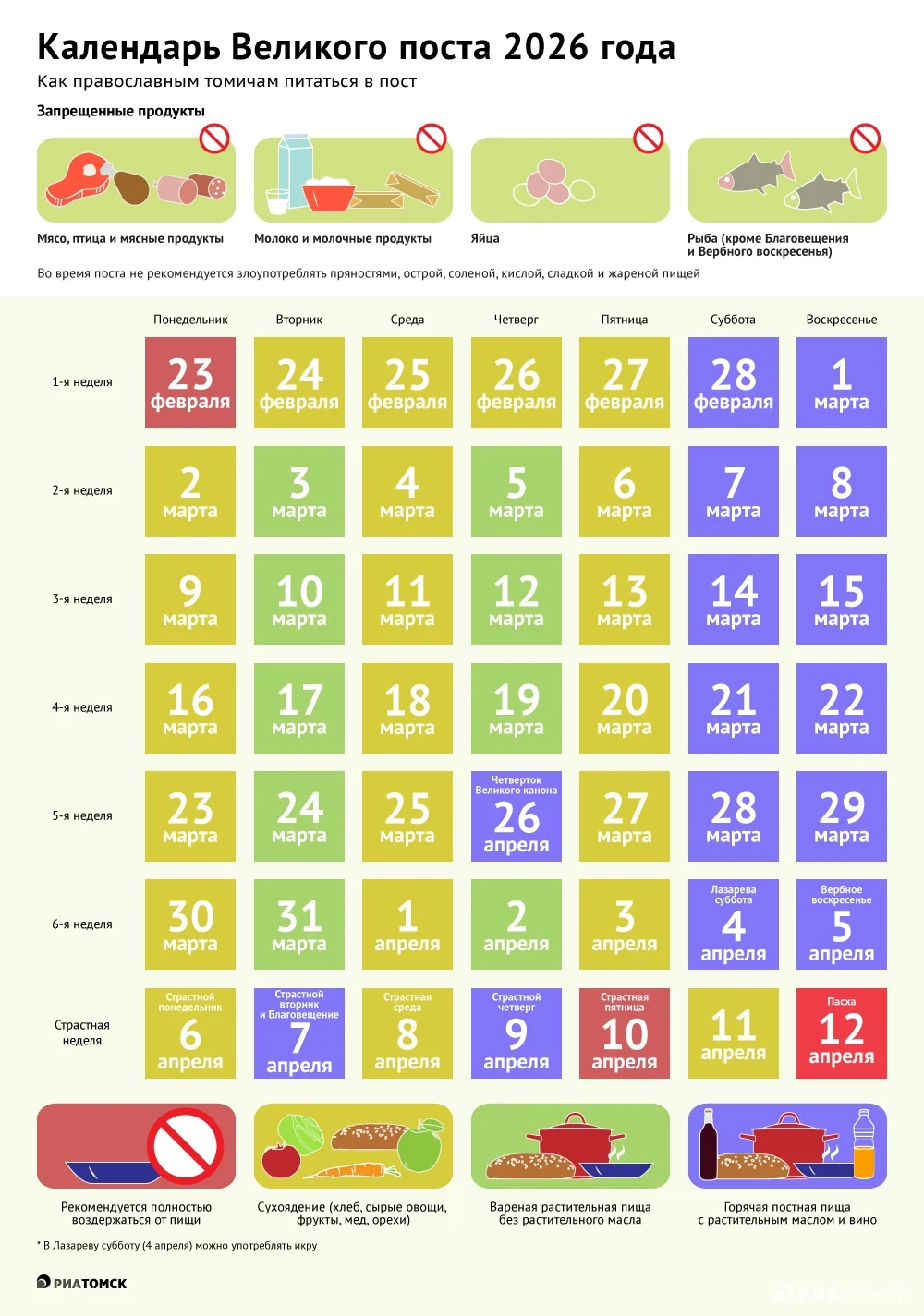 Великий пост у православных в 2026 году начнется 23 февраля, а закончится в День космонавтики – 12 апреля. Какие продукты и когда можно есть верующим? Календарь питания по дням – в инфографике РИА Томск.