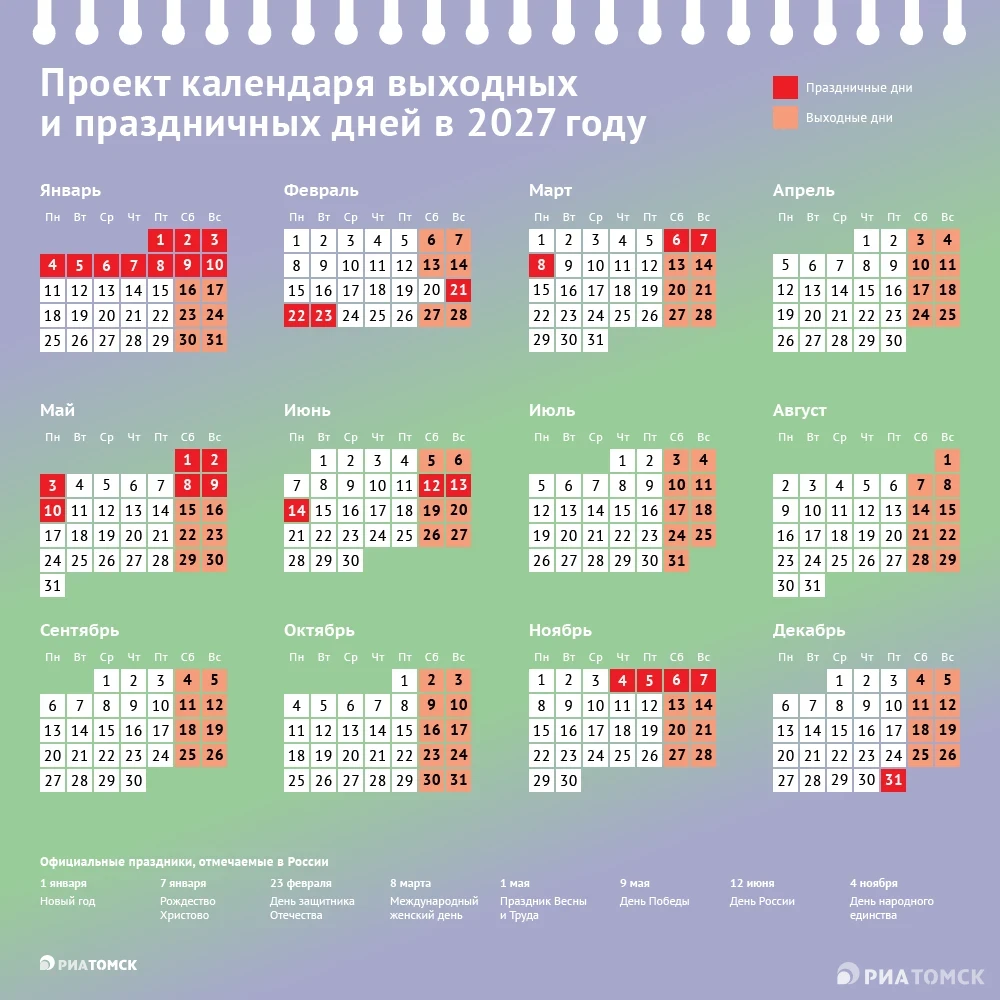 Сначала новогодние каникулы, потом 23 февраля, 8 Марта и майские… Проект производственного календаря, опубликованный в четверг Минтруда РФ, обещает россиянам стабильность и в 2027 году. Посчитать нерабочие дни можно по инфографике РИА Томск.
